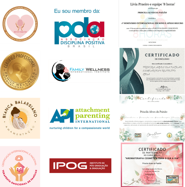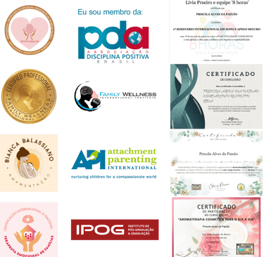 Tenho uma formação sólida como pós-graduada em Psicologia e Desenvolvimento Infantil e em Neurociência e Psicologia Positiva no Desenvolvimento Humano. Também sou Educadora Integrativa do Sono Infantil e Bem-Estar Familiar, Terapeuta do Sono Infantil, Terapeuta Emocional, Educadora em Disciplina Positiva para a Primeira Infância, Profissional em Desmame Gradual e Aromaterapeuta clínica.